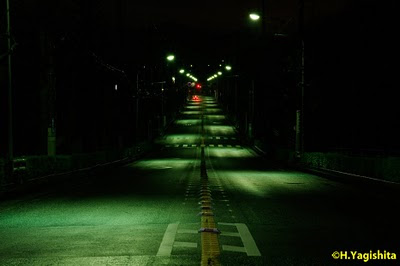 まっすぐ続く道をいくつもの街灯の光がスポットライトのように照らしていました。